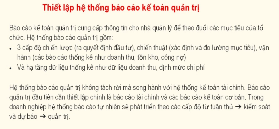 Hệ thống báo cáo quản trị không tách rời mà song hành với hệ thống kế toán tài chính. Báo cáo quản trị đầu tiên cần thiết lập chính là báo cáo tài chính và các báo cáo kế toán cơ bản. Trong doanh nghiệp hệ thống báo cáo tự nhiên sẽ phát triển theo các cấp độ từ tuân thủ ➔ kiểm soát và dự báo ➔ quản trị.