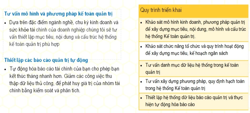 | 5 | Xây dựng mẫu báo cáo quản trị phù hợp ngành và thiết lập công cụ tổng hợp báo cáo tự động | Thiết lập báo cáo quản trị về KQKD được tổng hợp và trình bày tự động |