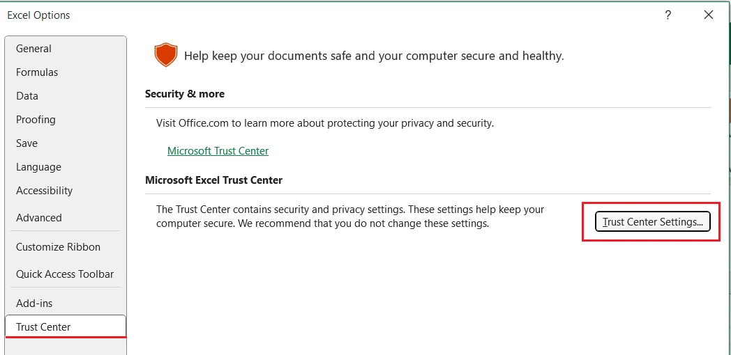 Vào File → Options → Trust Center → Trust Center Settings...
