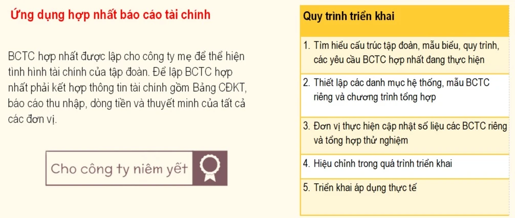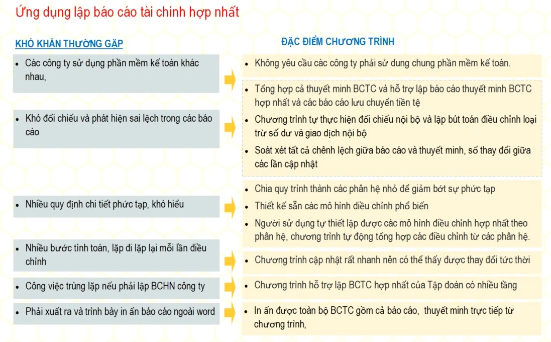 Một số công ty phần mềm kế toán cũng đưa ra phần mềm hỗ trợ hợp nhất nhưng chỉ dừng ở mức độ cộng ngang báo cáo và không linh hoạt do được thiết kế và xây dựng theo tư duy của chương trình kế toán.