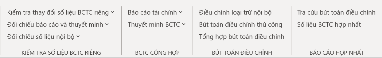 - Tổng hợp và lập đồng thời nhiều báo cáo hợp nhất của mô hình tập đoàn có sub-holding trong một chương trình, giảm được việc xử lý trùng lặp, không đồng nhất để nâng cao hiệu quả; Xem số liệu số liệu tổng hợp và hợp nhất theo từng tập đoàn;